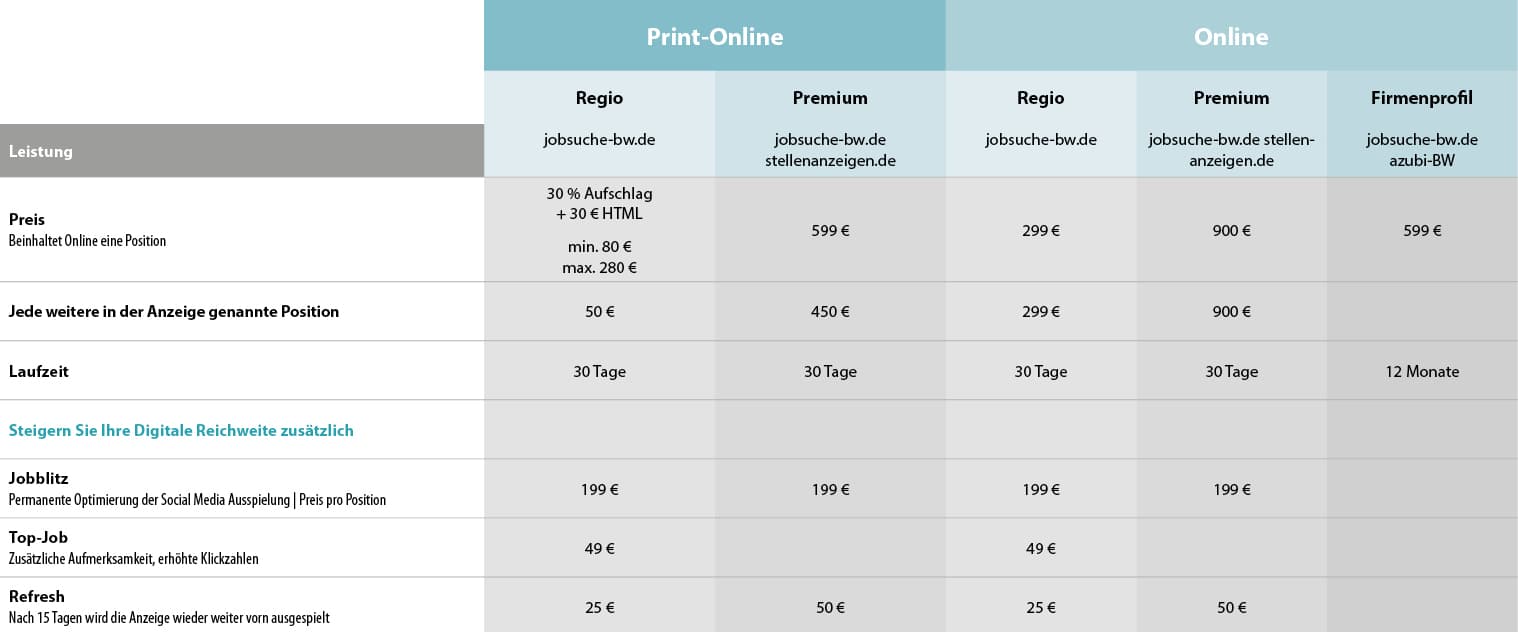 Die angegebenen mm-Preise gelten für s/w-Anzeigen (1c). Farbige Anzeigen (4c) werden mit einem 30 %-igen Aufpreis berechnet. Die angegebenen mm-Preise gelten branchenüblich für eine Spalte (45 mm). Zur Preis-Berechnung der bei uns üblichen 2- oder 4-spaltigen Anzeigen, multiplizieren Sie diesen Wert bitte mit dem Faktor 2 bzw. 4.